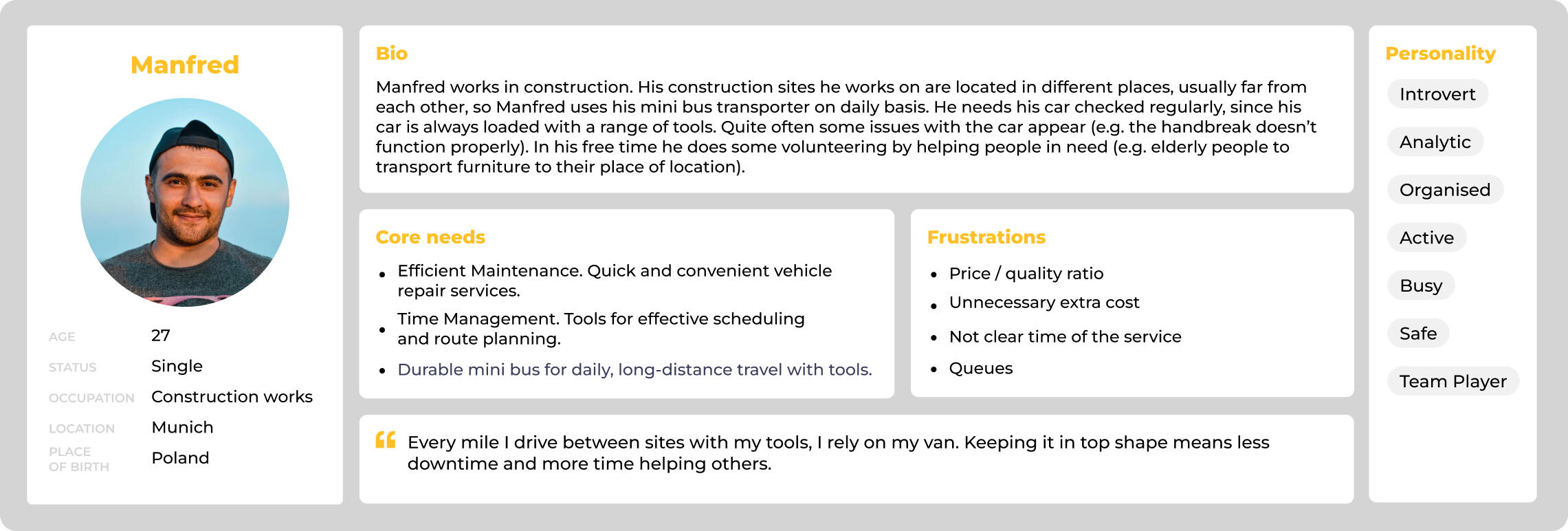 In creating the user persona, I focused on the fact that this is a person who uses the car on a regular basis. It's important for him or her to have contacts for car service.