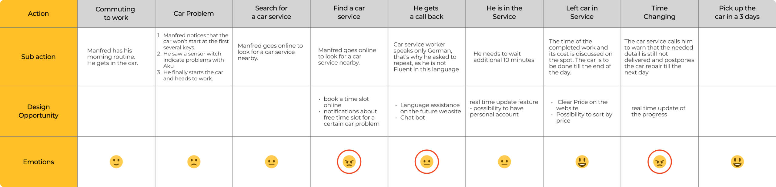 Next, I created customer journey maps. These maps illustrated the entire customer experience, from the moment User Persona considered booking a service to the completion of their car service. By identifying pain points and opportunities at each stage, I gained valuable insights into where I could make the most impactful improvements.